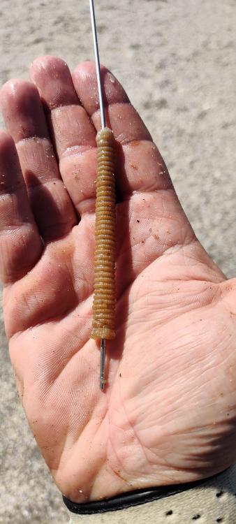 He visto en muchos videos de YouTube, diversos montajes de canutos de tita de palangre, y en la mayoría de ellos el resultado no es del todo satisfactorio. Quedan muy irregulares, con burbujas, pierden la forma y la consistencia rápidamente, y penalizan mucho el lance. Hay muchas formas de hacer un canuto de tita. Todas las que se les ocurran a los pescadores, que les den confianza y lo que es más importante, que les funcionen. Por suerte conozco y uso muchas de ellas, porque nunca sabes si ese día los peces la quieren cocida, a la plancha, brasa, al horno o al baño María, y hay que ir probando. Como lo que a mí me gusta es la pesca a larga distancia, vamos a hablar de realizar canutos que nos permitan meter un buen cebo y no nos penalicen el lance. Tal que así. Esta presentación permite ganar metros incluso usando una gameta larga suelta. Como lograrla? Hay que trabajar un poco. Cogemos una tita de palangre entera, la rebozamos en arena, y la vamos haciendo rodar entre las palmas de nuestras manos sin apretar demasiado. Con ello se irá estirando y perdiendo poco a poco dureza. Cuando ya le hemos dado un rato de sobeteo y varias decenas de vueltas, le cortamos las puntas y vaciamos el líquido y vísceras. Si quisiéramos canutos más gordos lo habríamos hecho al principio del todo. Después de vacía, seguimos con otro rebozado en arena, y haciéndola rodar entre nuestras manos, ahora ejerciendo bastante presión, hasta que quede bien delgada. Cortaremos un trozo de unos 8 cm, que se acabarán convirtiendo en unos 12cm de cebo final. La pasamos a una aguja de tita gruesa, y notaremos como no baila ni queda apenas holgura entre ambas, siendo bastante sencillo dar la lycra. El canuto de arriba está realizado con lycra gruesa porque no llevaba de otra ese día, pero para este montaje recomiendo el tubito rosa de la marca Stonfo, que es la más fina del mercado y la que menos se mueve. Y ahora viene el paso fundamental, y donde la gran mayoría de pescadores falla: dar la lycra. La lycra hay que darla hacia atrás y no hacía delante. Empezamos por un extremo, buscamos el primer o segundo anillo, que es como una especie de surco circular, y le damos 7-8 vueltas tensas con la lycra Stonfo sin salirnos. Sin estirar, buscamos el siguiente anillo, le damos la primera vuelta algo floja, y unas 5 encima ya con buena tensión, y así hasta el otro extremo, anillo por anillo. Así mantenemos una presión con nuestros dedos y la lycra a la vez en una zona muy concreta, favoreciendo un acabado muy regular. Al final como se aprecia en la parte de abajo, gracias a que fue lycra gruesa, le hago varios nudos. Cortamos con una tijera bien afilada cualquier fleco de tita o lycra, si es que quedara alguno, y a pescar. Os aseguro que aguanta muchísimo la forma y la consistencia de esta manera, sin aparecer burbujas, y por tanto pescando efectivamente durante más tiempo. Con ello reducimos el gasto de cebo, el número de lances, y lo que es más importante, de plomazos en el agua. Puede parecer algo tedioso, pero una vez le pillas el truco a esta manera se tarda el mismo tiempo que haciéndolo de forma arbitraria e irregular. Para dorada los suelo hacer normalmente algo más gorditos, pero a más volumen tenemos que tener en cuenta que más cerca caeremos, porque afecta muchísimo al rozamiento con el aire. Para distancia máxima de esta manera que acabo de mostrar, y si es con bait clip, todavía mejor Saludos.