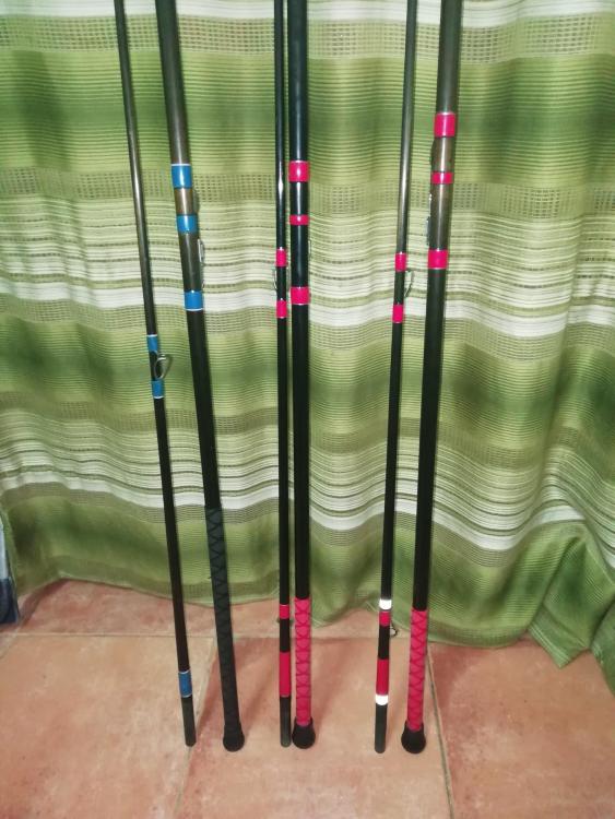 Se venden 3 de estas cañas por exceso de material. 2 llevan fuji acero inox y la del epoxi azul fuji titanio. 750€ las 3 600 la pareja 300 una suelta que seria la anillada en azul (fuji titanio)